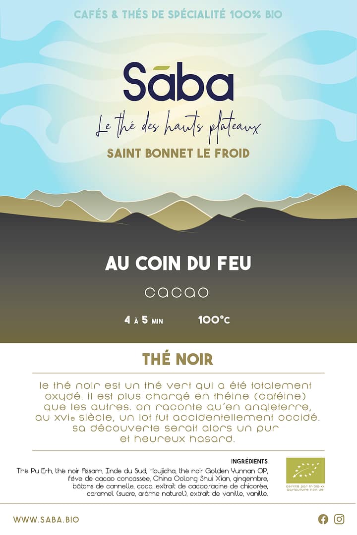 Thé Pu Erh de Chine*, thé noir Assam*, -Inde du Sud*, Houjicha*, thé noir Golden Yunnan OP*, fève de cacao concassée*, China Oolong Shui Xian*, gingembre*, bâtons de cannelle*, coco*, extrait de cacao*, racine de chicorée*, CARAMEL (SUCRE, ARÔME NATUREL)*, extrait de vanille*, vanille*.