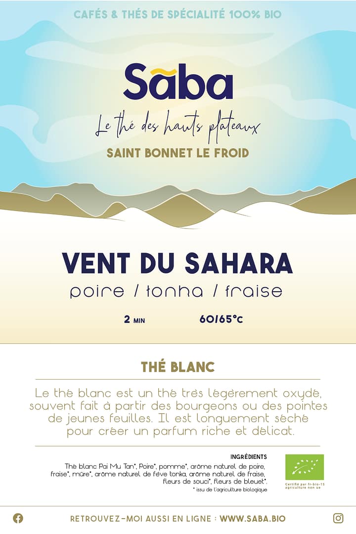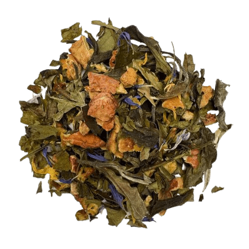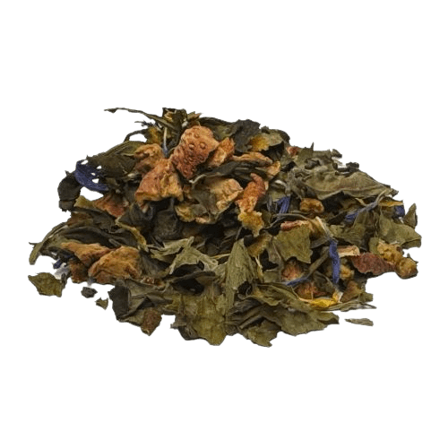 Thé blanc Pai Mu Tan*, poire*, pomme*, arôme naturel de poire, fraise*, mûre*, arôme naturel de fève tonka, arôme naturel de fraise, fleurs de souci*, fleurs de bleuet*.